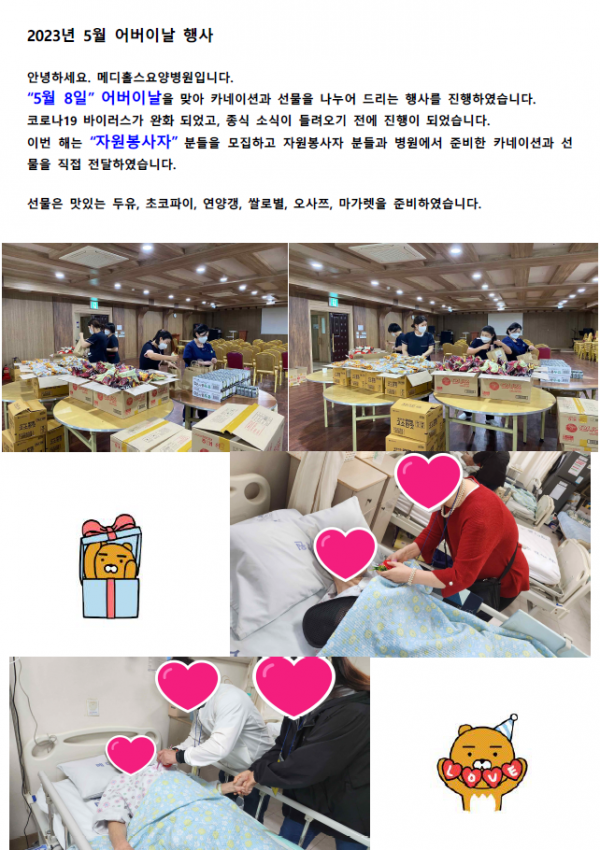 2023년 5월 어버이날 행사 페이지 정보 작성자 메디홀스 작성일23-05-16 15:53 조회1,880회 댓글0건 관련링크 이전글 다음글 목록 본문 . 댓글목록 등록된 댓글이 없습니다. 이전글 다음글 목록