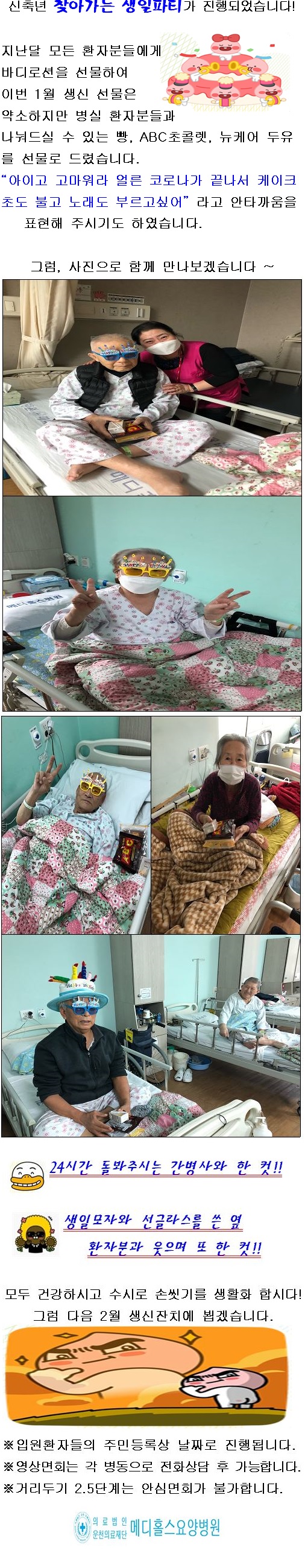신축년 1월 "찾아가는 생신파티" !! 페이지 정보 작성자 메디홀스 작성일21-02-04 16:23 조회2,667회 댓글0건 관련링크 이전글 다음글 목록 본문 - 댓글목록 등록된 댓글이 없습니다. 이전글 다음글 목록
