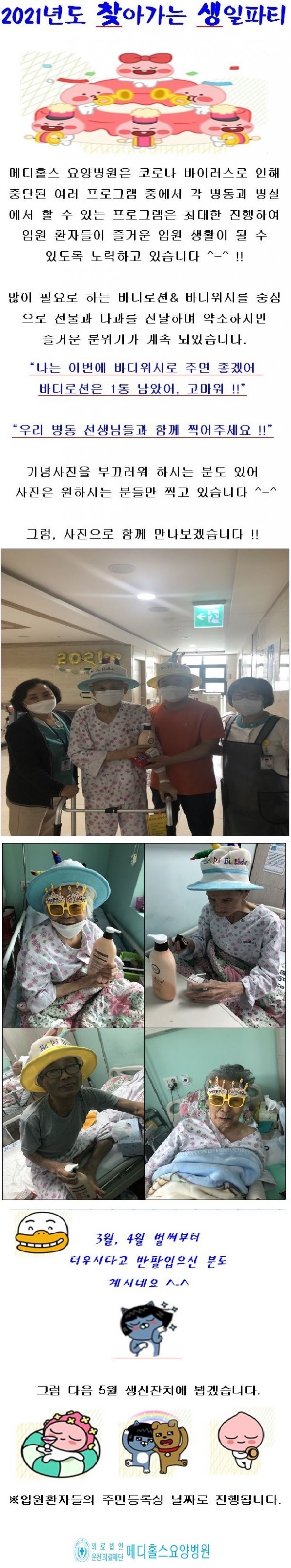 2021년 찾아가는 생일파티! 3-4월 !! 페이지 정보 작성자 메디홀스 작성일21-05-04 11:47 조회2,614회 댓글0건 관련링크 이전글 다음글 목록 본문 - 댓글목록 등록된 댓글이 없습니다. 이전글 다음글 목록