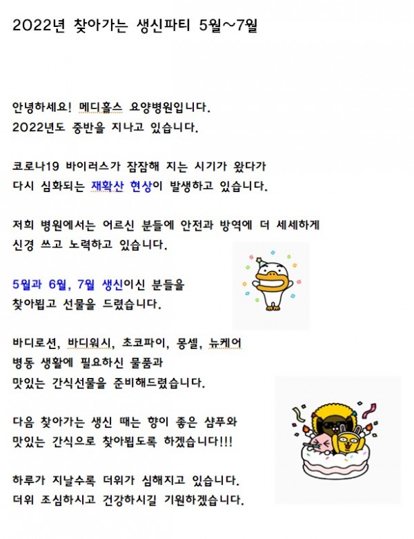 2022년 찾아가는 생신파티 5월~7월 페이지 정보 작성자 메디홀스 작성일22-08-05 17:08 조회2,052회 댓글0건 관련링크 이전글 다음글 목록 본문 - 댓글목록 등록된 댓글이 없습니다. 이전글 다음글 목록
