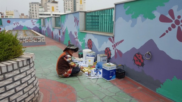 회색 페인트만 있던 옥상벽이 날마다 조금씩 변하고 있어요. . 잠자리가 날고 풍뎅이가 뛰더니 오늘은 근사한 수풀집으로 단장이 한창이네요. .